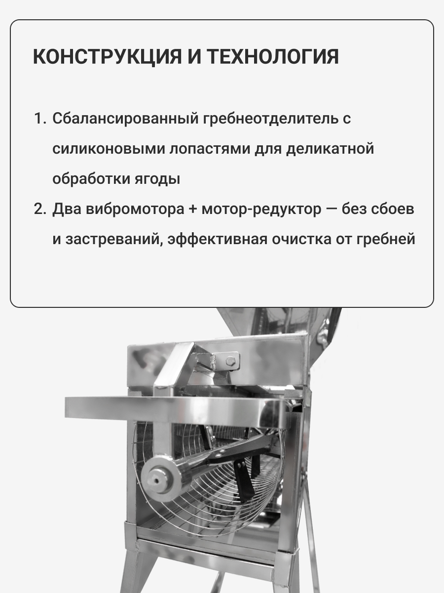 • Сортировщик оснащен двумя высококачественными вибромоторами, а также мотором-редуктором для обеспечения работы без заторов и дополнительной очистки маленьких остатков гребня, что позволяет проводить сортировку ягоды при неизменной производительности.